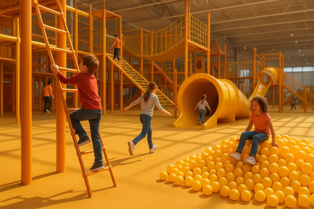 Fixez un point de rendez-vous visible dès l’arrivée pour retrouver vos enfants facilement. Les aires de jeux sont segmentées par âge : piscines à balles pour les petits, trampolines ou accrobranches indoor pour les plus grands, conformes aux normes de sécurité (EN 1176).